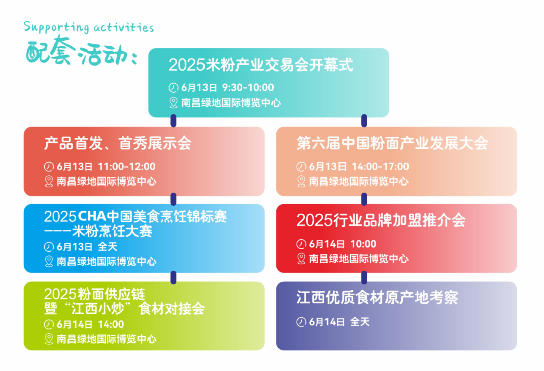据了解,交易会期间将举办多场丰富多彩的产业对接活动,包括:第六届中国粉面产业发展大会,探讨米粉产业的未来趋势;产品首发首秀展示会,展现企业创新力,引导品牌化发展;“江西小炒”食材对接会,精准匹配供应链需求,强化商贸对接实效;品牌加盟推介会,促进粉面连锁餐饮的发展;2025米粉烹饪总决赛,展现中华主食文化的独特魅力;还有江西优质食材原产地考察,让采购商深入粉面生产车间,看产品、谈合作、促成效。