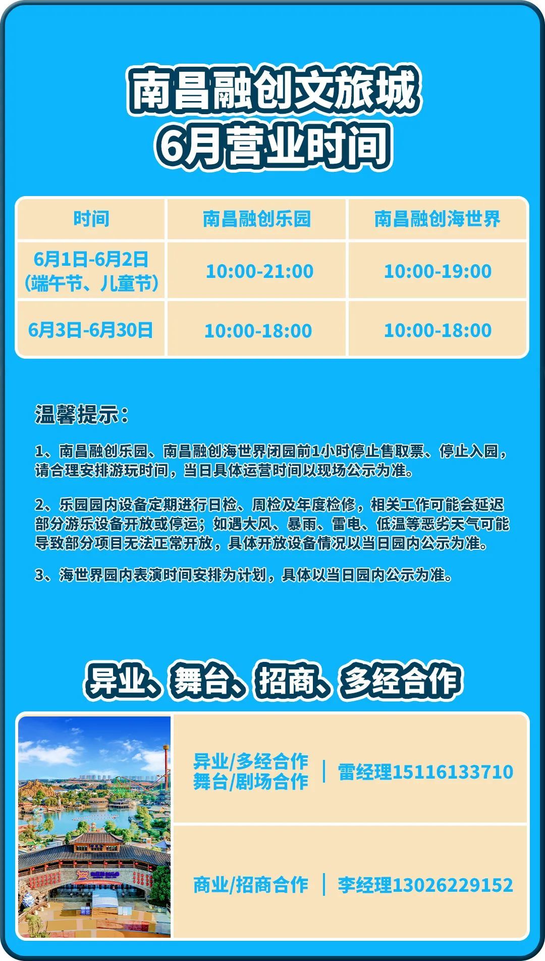 受天气原因影响,为保障游客出行安全及游玩体验,南昌融创乐园2025年6月11日提前至14:00闭园,南昌融创海世界正常运营。已在网上预订南昌融创乐园门票的游客,可在原渠道申请退款,详情请咨询400-895-9888。