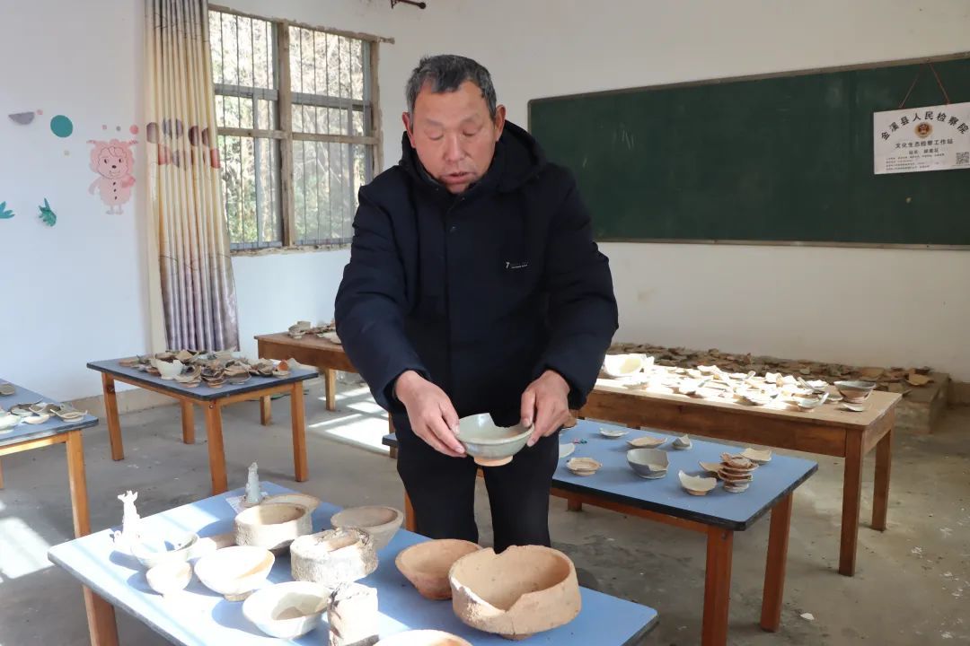 杂草堆里抢救出来的瓷片被朱小慧搬进课堂,给孩子们讲“瓷器上的历史”,让非遗技艺在孩子心中生根,他还建了一间“陶瓷标本室”,上千片色泽温润的瓷片整齐排列——影青瓷的透薄、黑釉瓷的厚重、刻花瓷的细腻,活脱脱一座 “微型陶瓷博物馆”。