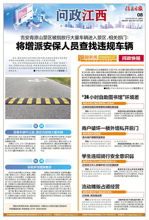 鹰潭市余江区公安局交通警察大队:已安排2名工作人员在上下学高峰期维护校门口交通秩序,并联合教体局开展交通安全宣传教育。