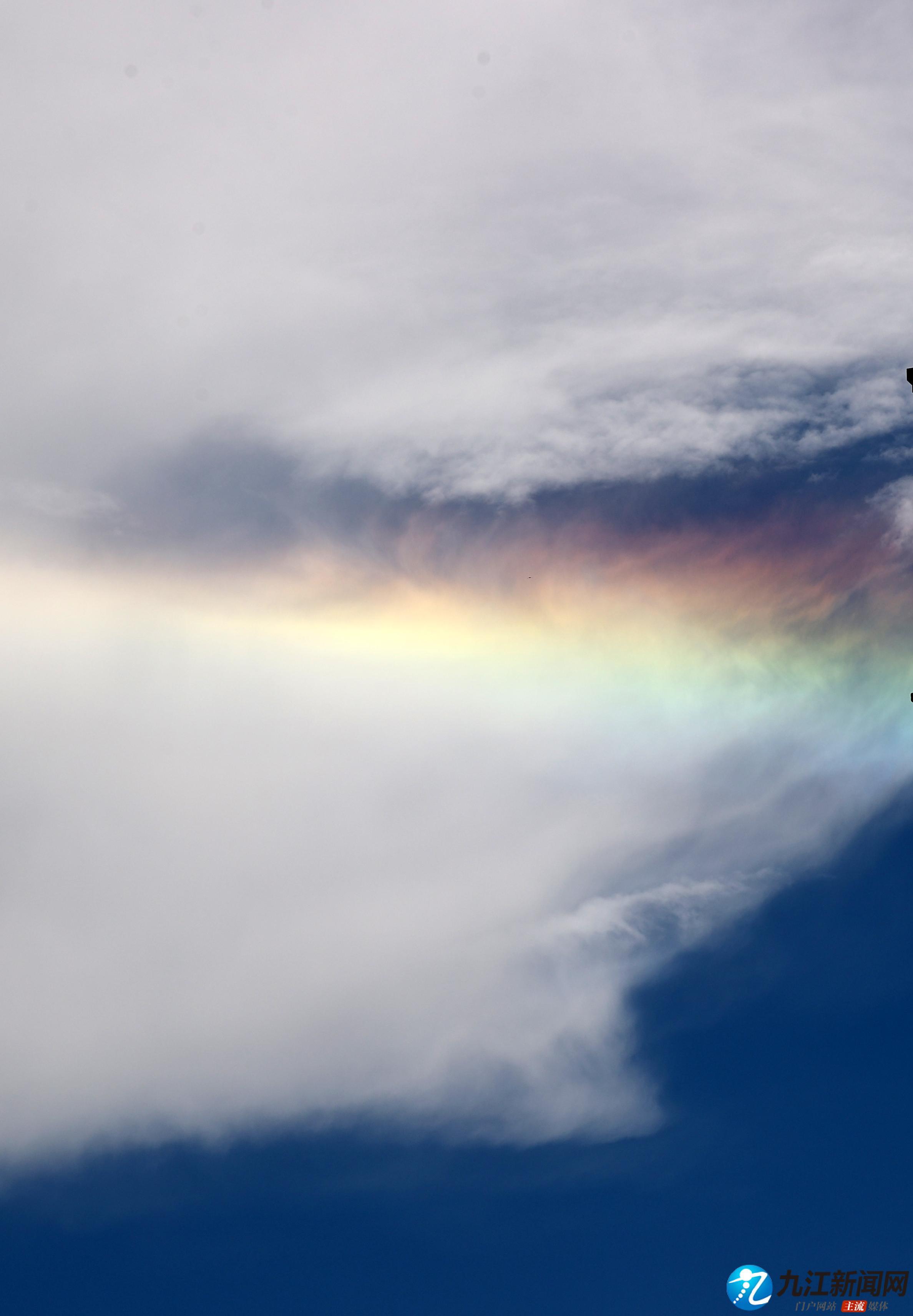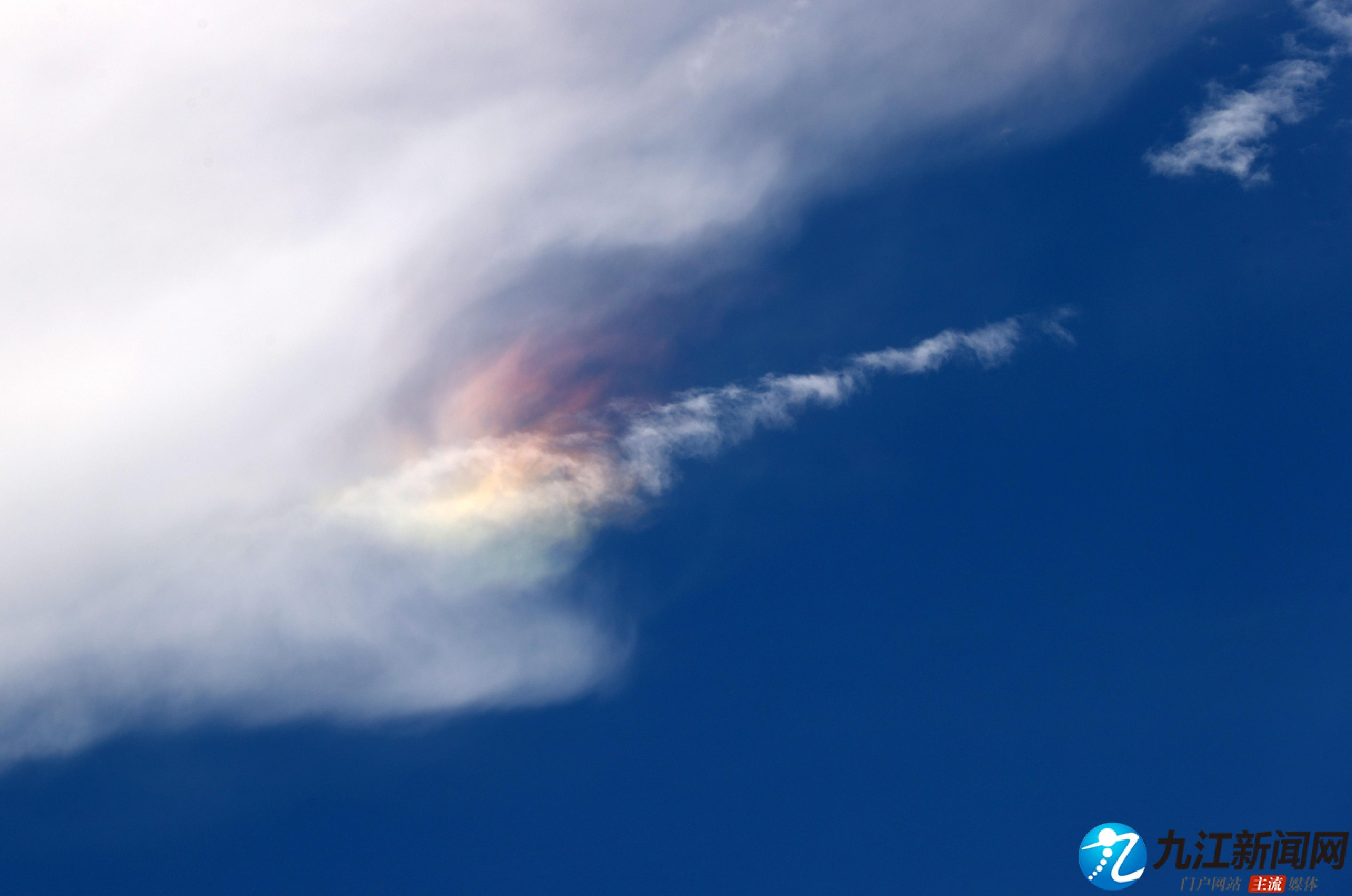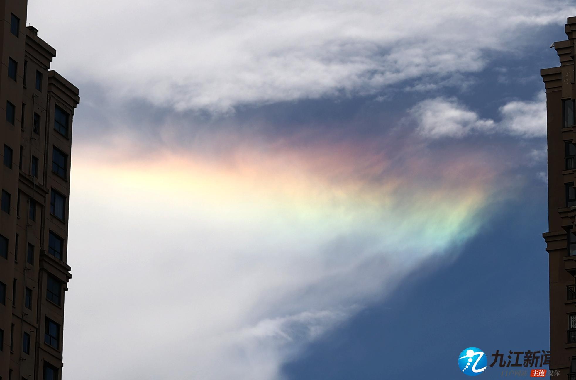 6月14日中午时分,八里湖上空出现一片彩色的云,色彩斑斓、甚是美丽。据悉,七彩云属于典型的“日华”现象,在特定的气象条件下,太阳光线通过云彩中的冰晶结构时发生折射和反射,形成七彩光芒。(九江日报全媒记者 刘家 摄)