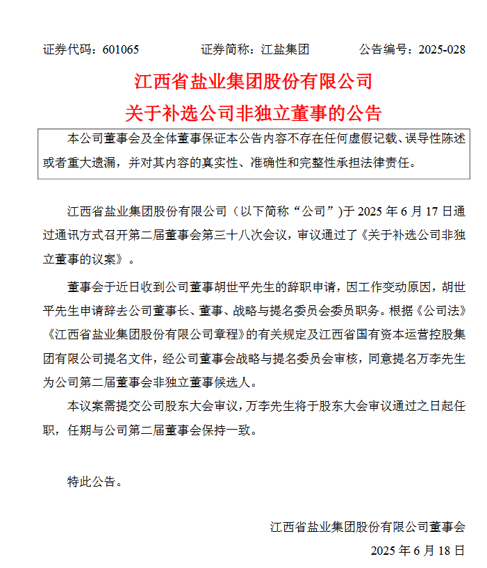 因工作变动原因,胡世平先生申请辞去公司董事长、董事、战略与提名委员会委员职务。根据《公司法》《江西省盐业集团股份有限公司章程》的有关规定及江西省国有资本运营控股集团有限公司提名文件,经公司董事会战略与提名委员会审核,同意提名万李先生为公司第二届董事会非独立董事候选人。