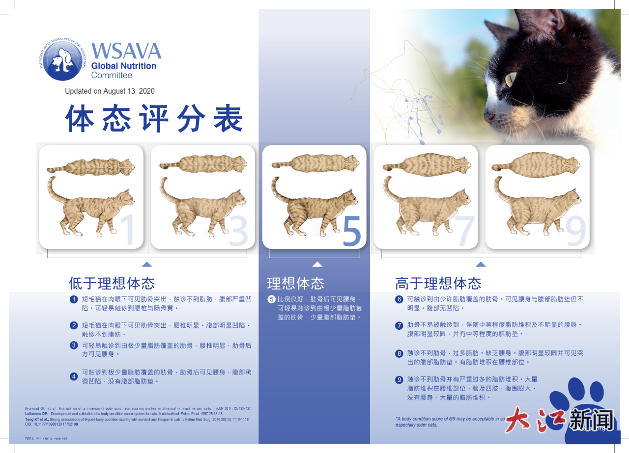 另外,WSAVA(世界小动物兽医协会,World Small Animal Veterinary Association)曾发布有关猫咪体态的评分表,根据该评分表,比例良好,肋骨后可见腰身,可轻易触诊到由极少量脂肪复盖的肋骨,少量腹部脂肪垫是猫咪的理想体态。