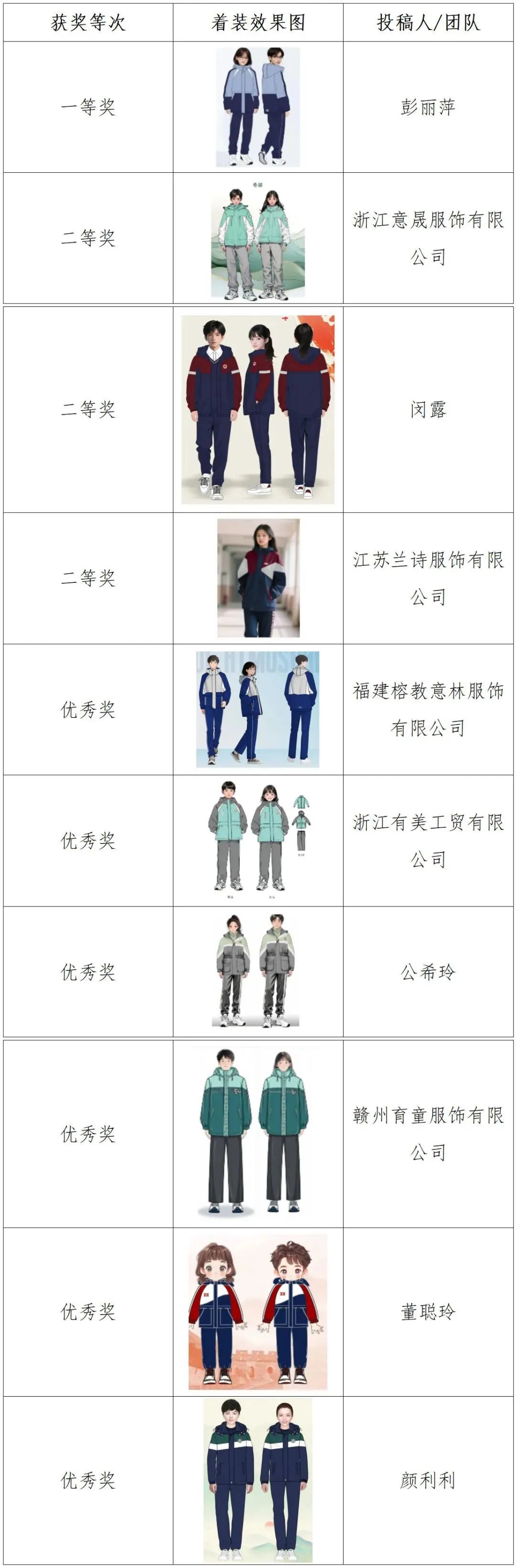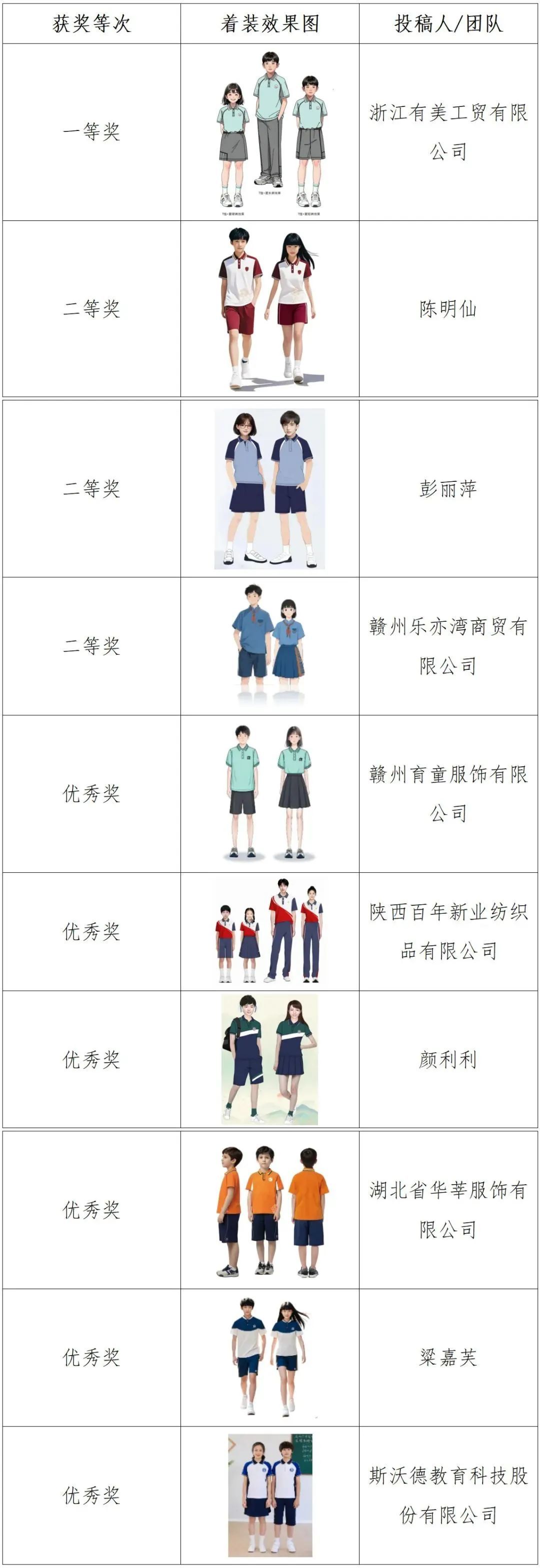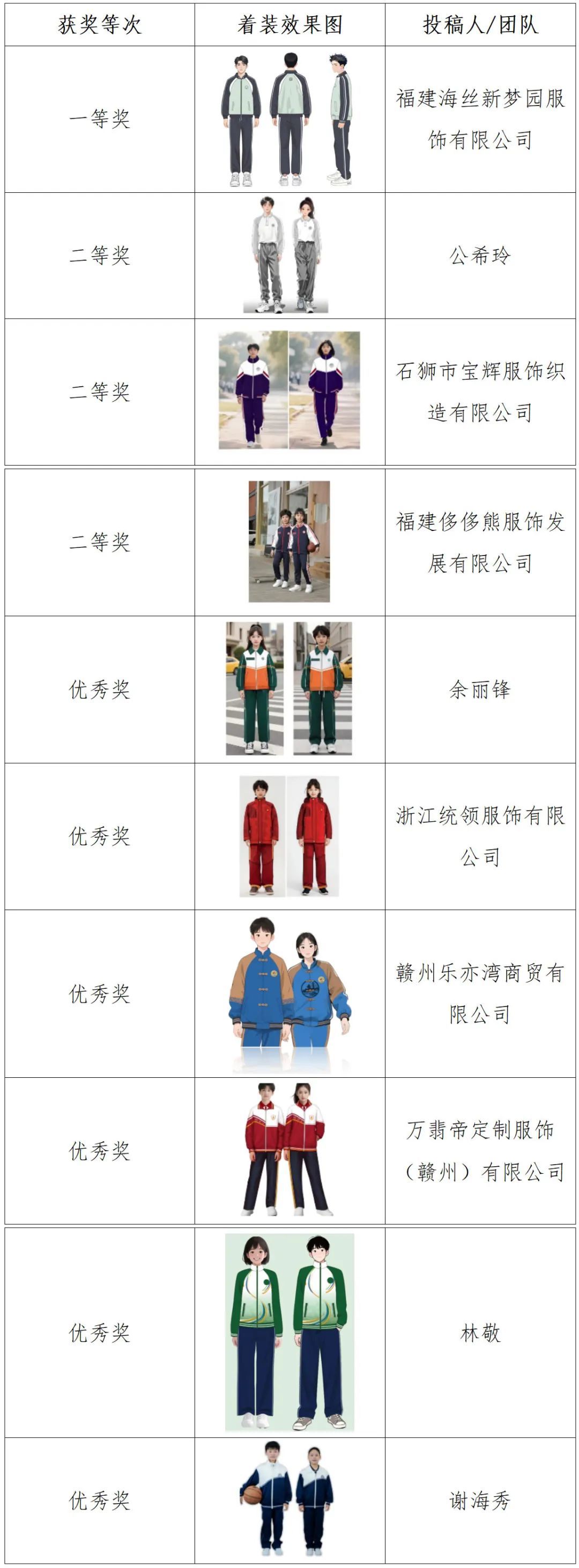 根据《关于征集赣州市中小学生统一校服款式的公告》安排,2025年6月10日至19日通过网络投票的形式由社会公众对春秋装、夏装、冬装各10款入围作品进行了投票。根据公众投票结果,现将春秋装、夏装、冬装三类校服款式获奖作品公示如下: