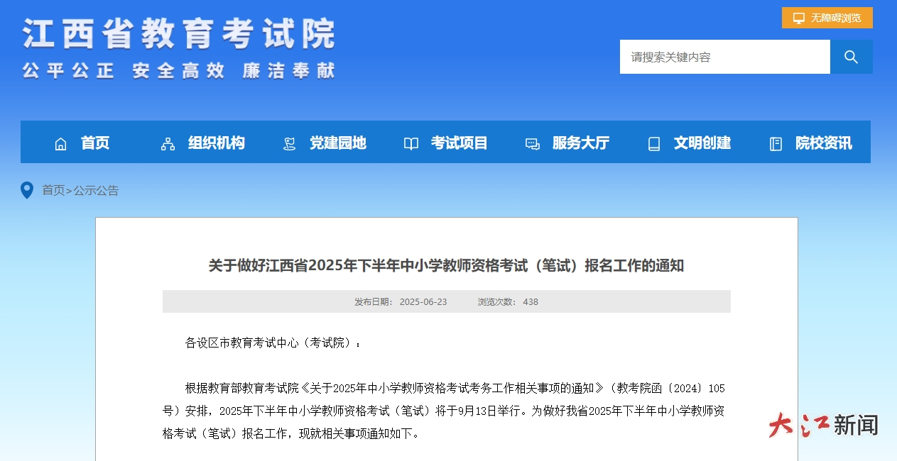 大江网/大江新闻客户端讯 全媒体记者李思成报道:6月23日,江西省教育考试院发布《关于做好江西省2025年下半年中小学教师资格考试(笔试)报名工作的通知》。《通知》指出,2025年下半年中小学教师资格考试(笔试)将于9月13日举行。