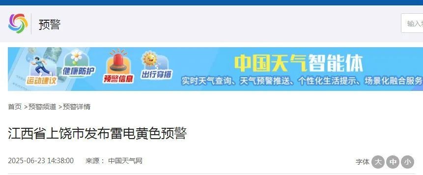 上饶市气象台2025年6月23日14时38分变更雷电黄色预警信号:预计未来6小时内,余干县、鄱阳县、德兴市、信州区、玉山县、弋阳县、横峰县、广信区、铅山县、万年县、广丰区、婺源县、上饶市经开区、三清山、高铁新区的部分地区有雷电活动,局地伴有短时强降水、雷暴大风等强对流天气,请注意防范。(预警信息来源:国家预警信息发布中心)