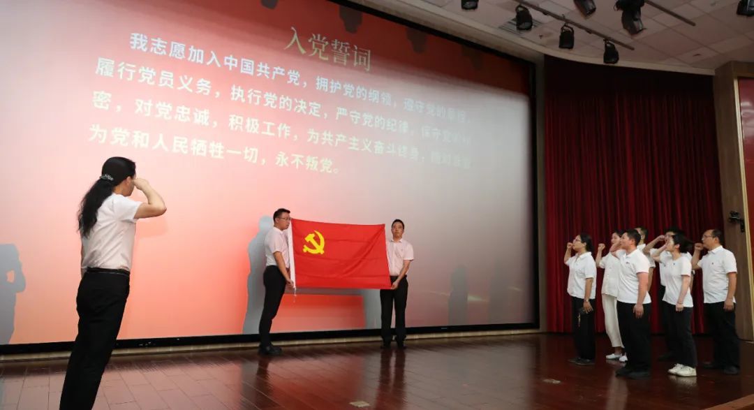 8名新党员面对鲜红的党旗庄严宣誓,与会全体党员一起重温入党誓词。入党誓词是座右铭,是行动指南,是党员向党和人民作出的庄严承诺。这铿锵誓言,就是守护人民健康、不负党和人民重托的坚定承诺与行动号角。(郭盈盈)