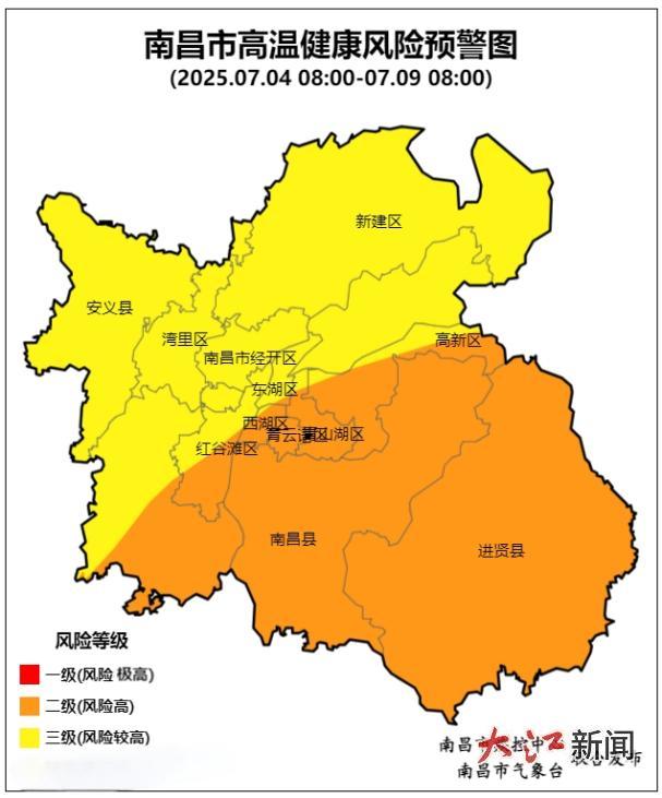 晴热持续高温不断升级,7月3日,南昌市疾控中心(市卫健执法局)、南昌市气象台联合发布高温健康风险预警:7月4日8时至9日8时,南昌市大部分地区的高温健康风险等级较高,其中南昌县、进贤县、西湖区、青云谱区、青山湖区、高新区部分地区的高温健康风险等级高。