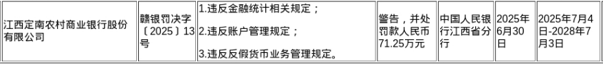 罚单显示,江西定南农村商业银行股份有限公司的主要违法违规行为是:违反金融统计相关规定、账户管理规定和反假货币业务管理规定。