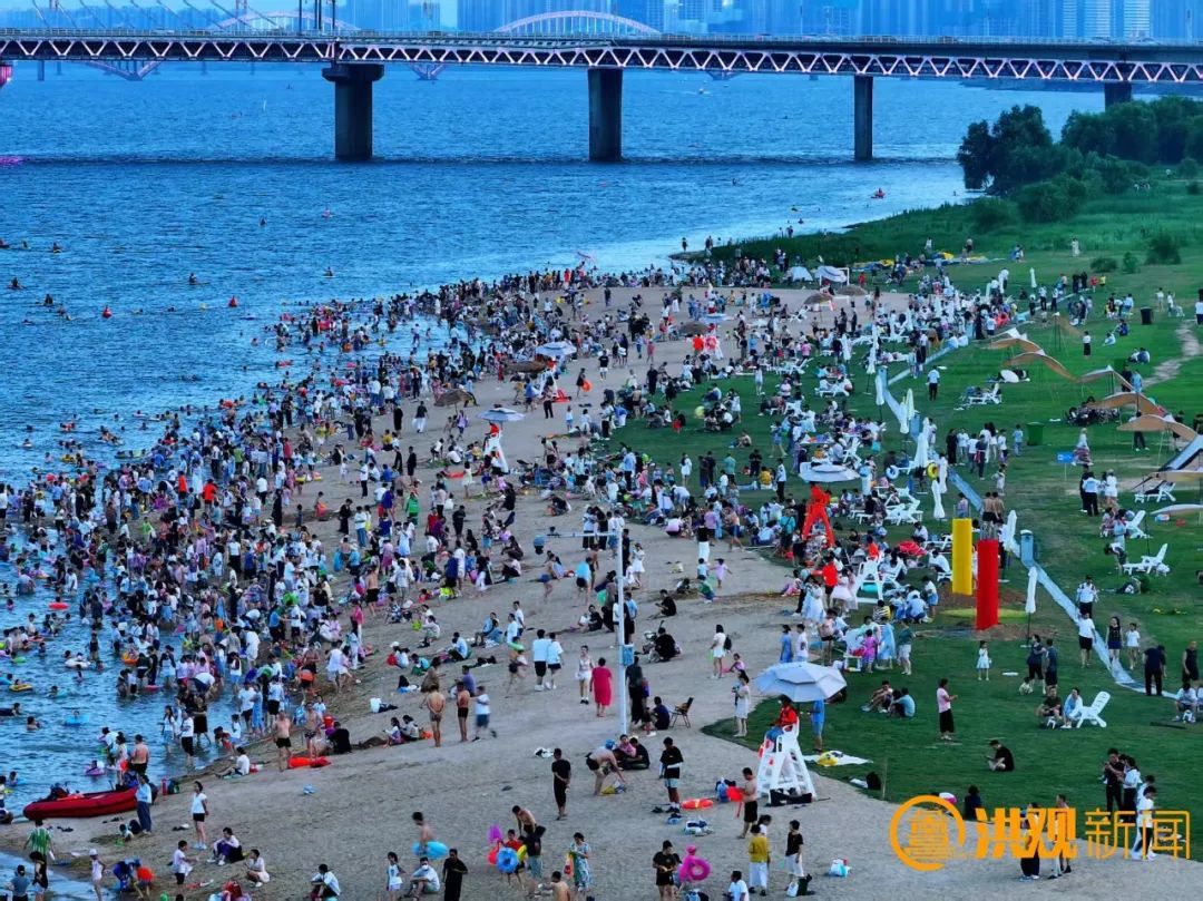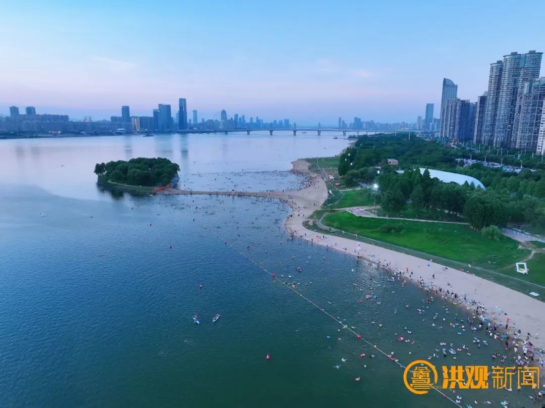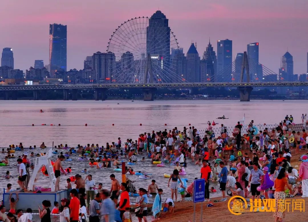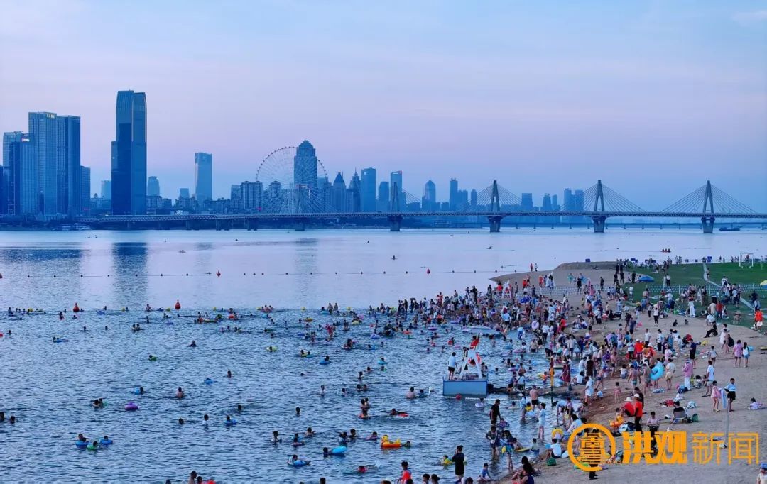 南昌赣江“两滩七湾”天然泳场大都与周边夜市相隔不远,不少游客游完泳后特意绕路去打卡。“在江里游完泳,去吃份白糖糕和糊羹,这才是南昌的夏天。”在万紫滩,来自江西赣州的游客郑畅,正对着导航规划去绳金塔的路线,她手机里存着网友分享的“泳场+老城” 攻略,标注着从江滩到街巷的美食打卡点。