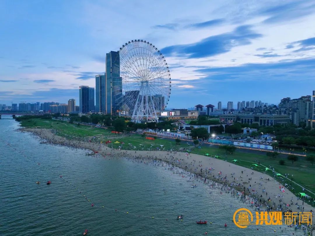 对岸的摩天湾热闹丝毫不输。18时许,夕阳为“南昌之星”摩天轮镀上一层温暖的金边,与江滩的热闹氛围相映成趣。江面上,游泳爱好者们结成小队,向着远处的浮标游去;沙滩上,一对对情侣铺着野餐垫,共享一副耳机里的旋律,随着天色渐暗,摩天轮的灯光次第亮起,为他们的合影增添了浪漫滤镜。