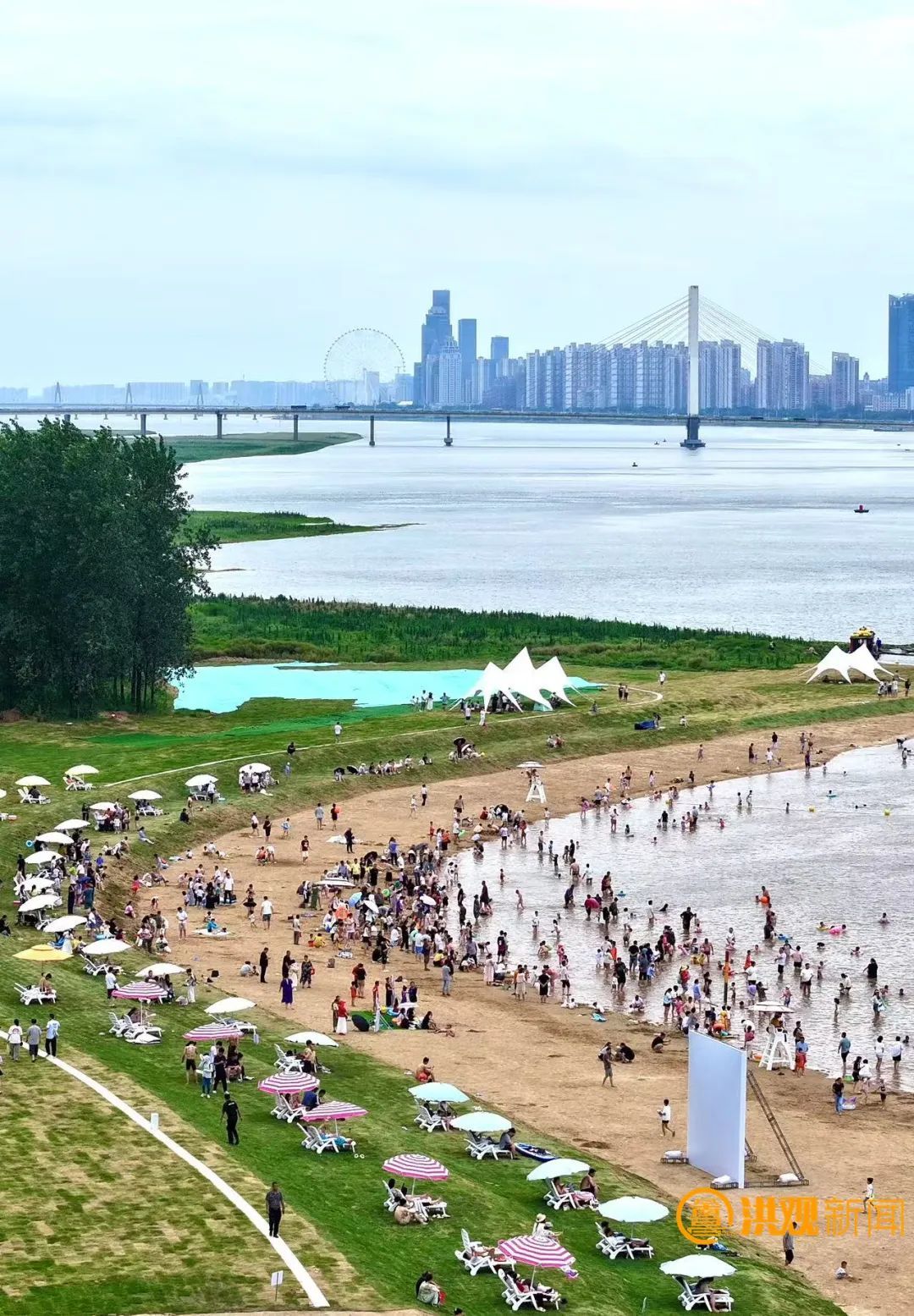 来自湖北武汉的刘萍萍第一次来南昌,她举着手机录下沙滩全景,镜头里不断闪过奔跑的孩子和戏水的人群:“没想到南昌有这么舒服的天然泳场,沙子比海边的还细软,刚才在江里游到浮标处,回头看沙滩就像铺了一层金箔,太壮观了。” 她的同伴正蹲在沙滩上,用树枝画着大大的笑脸。