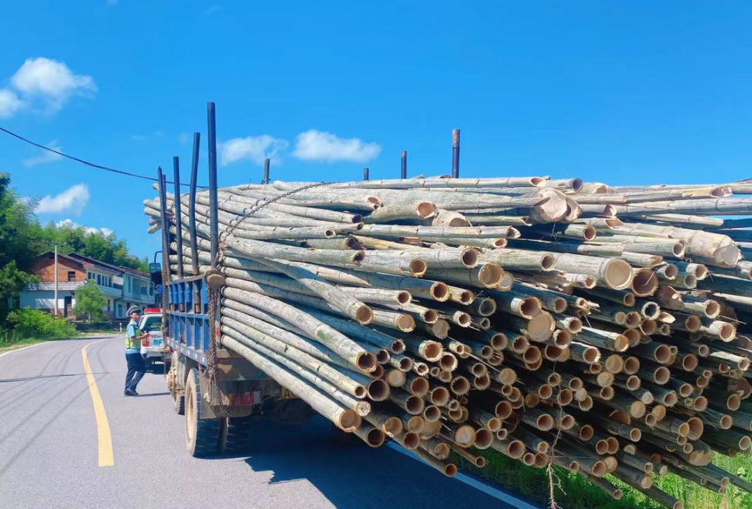 6月27日,黎川公安交警在日常巡逻途中,发现一辆货车装载竹子严重超长(尾部伸出4米),犹如“移动的竹林”,民警立即责令整改消除隐患。