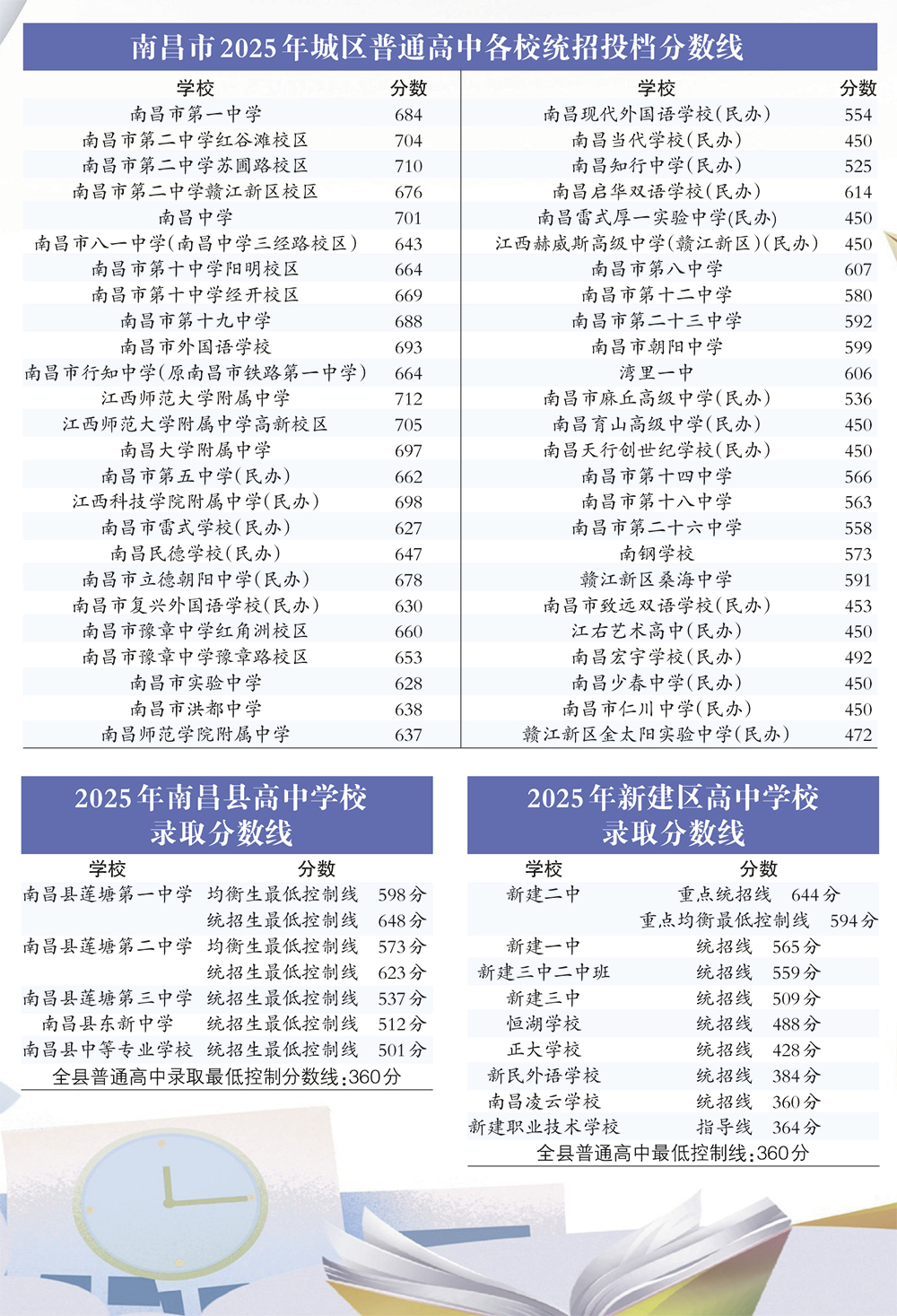 江西晨报讯(记者 程玥) 7月6日,记者从南昌市教育考试院获悉,南昌市2025年高中阶段招生最低控制分数线(指导线)及南昌城区普通高中各校统招投档分数线划定公布。
