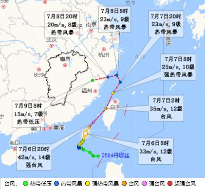 今年第4号台风“丹娜丝”于7月5日凌晨在南海东北部海面上生成,8日将在浙江中南部一带登陆。受“丹娜丝”减弱后的低压或其外围环流影响,8~9日江西省大部分地区有阵雨或雷阵雨,局部地区有暴雨到大暴雨,风力有所加大,江湖水面、平原河谷阵风7级左右,高温略有缓和。10~14日江西省大部分地区仍多雷阵雨天气。
