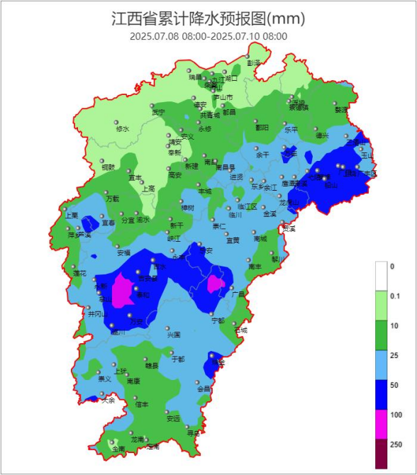 7月 8~9日:赣北南部、赣中和赣南多云转阴,有阵雨或雷阵雨,部分地区有大雨,局部地区有暴雨到大暴雨;赣北北部多云间阴天,部分地区有阵雨或雷阵雨。雷雨来时,局地有强雷电、短时强降水等强对流天气。