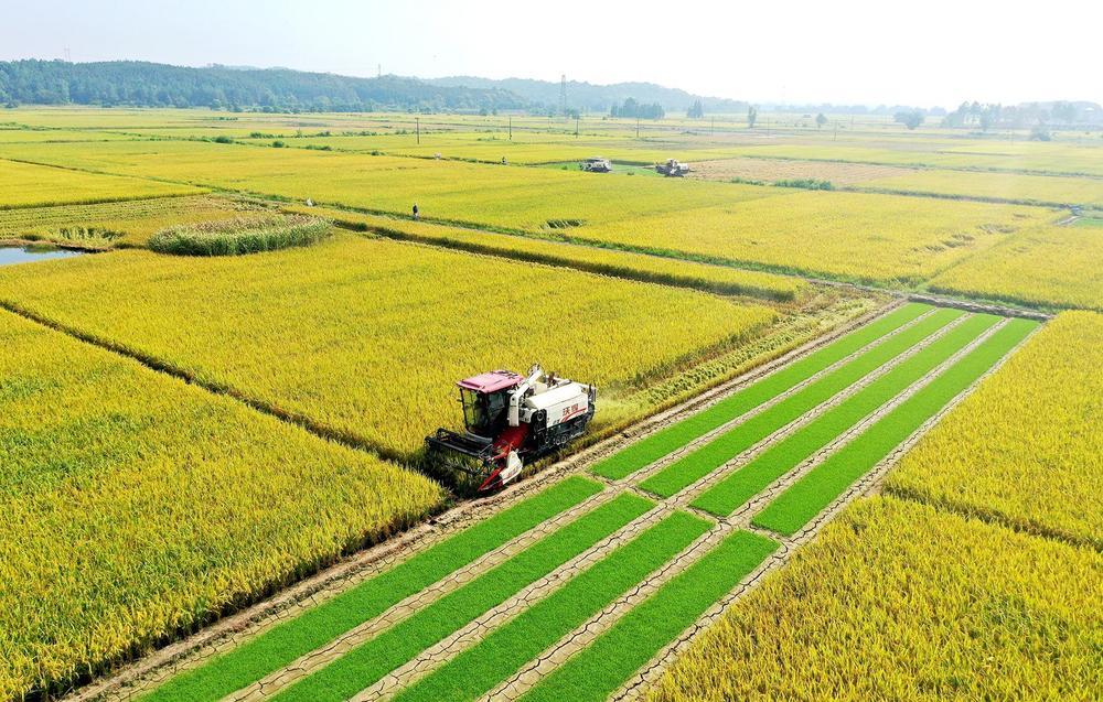 7月5日,上高县新界埠镇洲上村村民在收割早稻。连日来,持续的高温天气下,早稻逐渐进入收割期,上高县各地农民抢抓农时抢收早稻,确保颗粒归仓。 (陈旗海 徐 政 摄)
