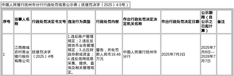 蓝鲸新闻7月9日讯,近日,中国人民银行抚州市分行发布了罚单,剑指江西南城农村商业银行股份有限公司。