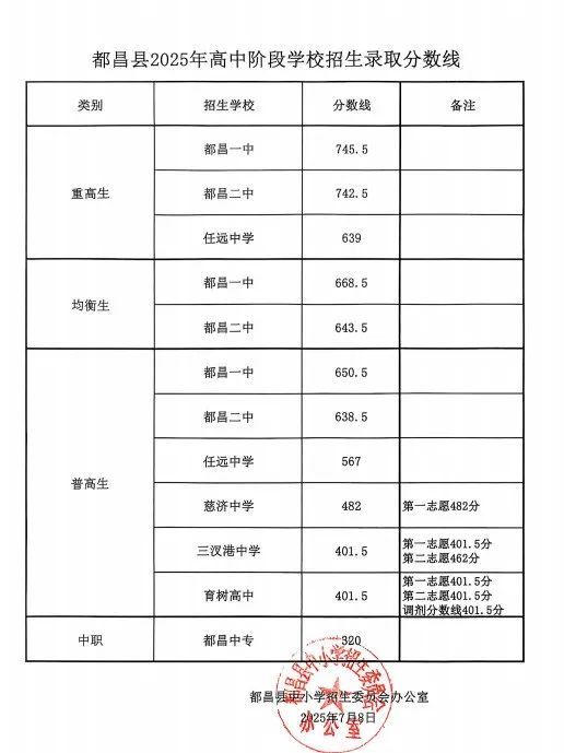根据《瑞昌市2025年中小学招生工作实施意见》和《瑞昌市2025年高中阶段学校招生录取方案》规定,经市中招委审定,现将我市高中阶段学校录取分数线公布如下: