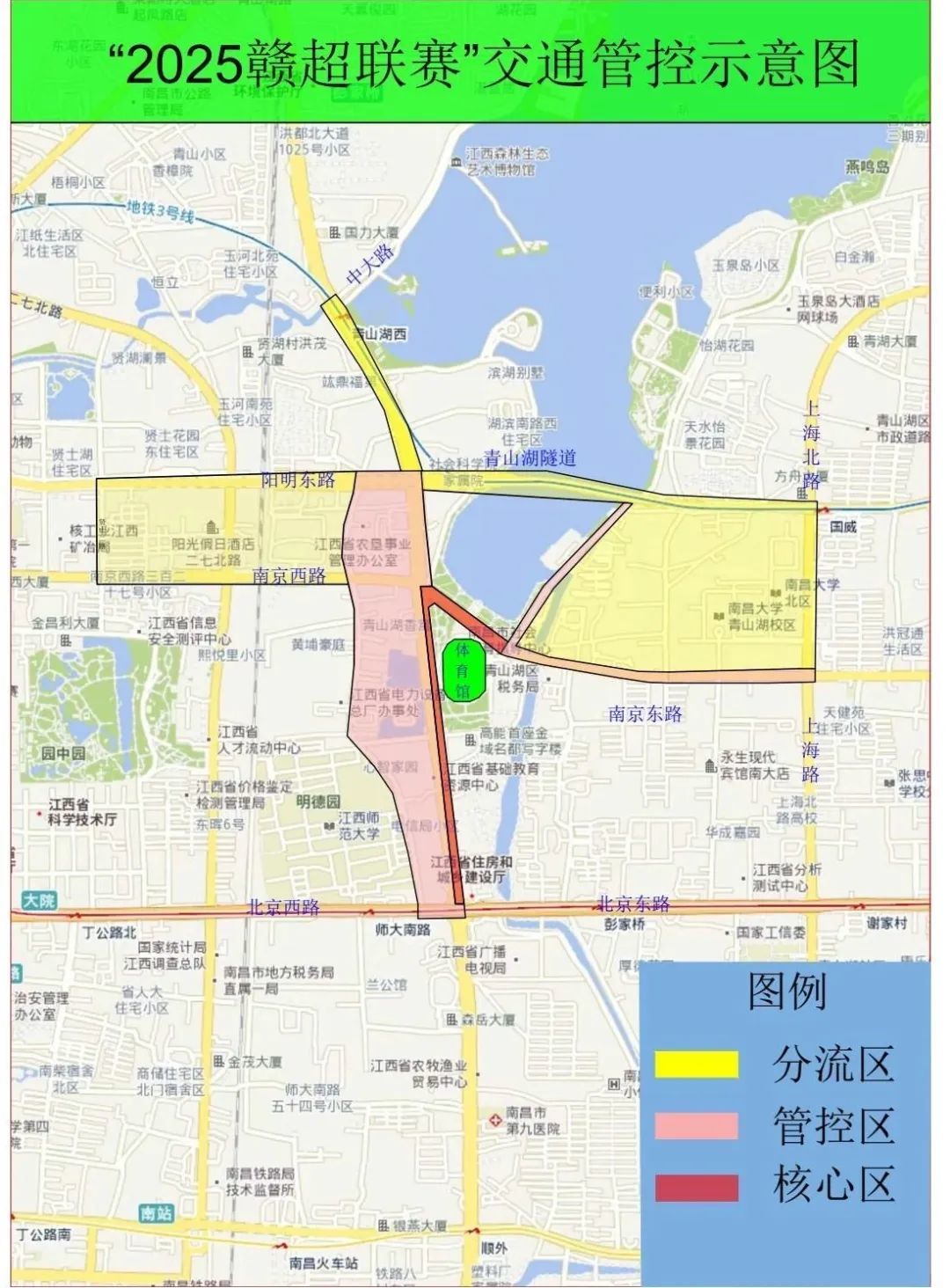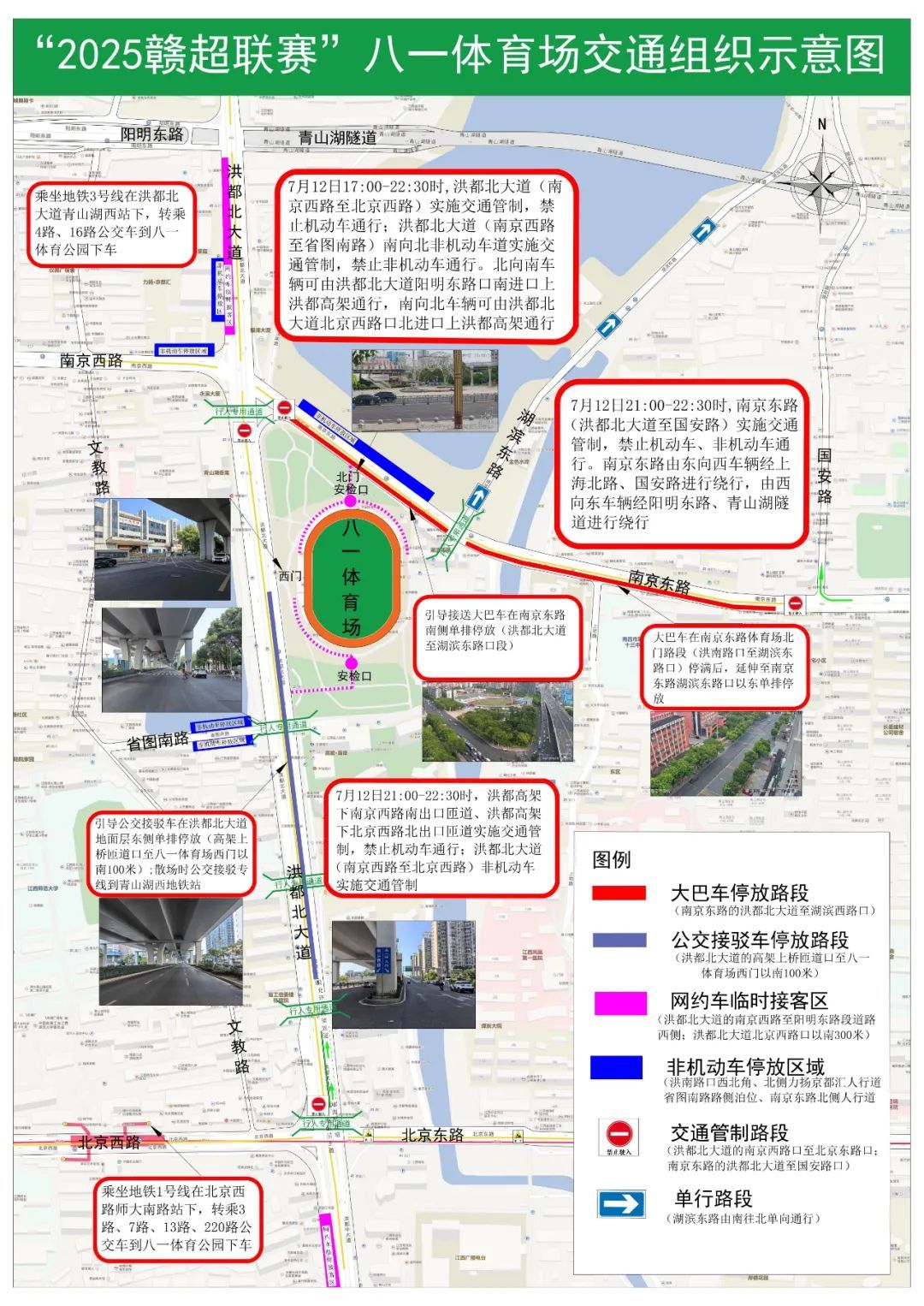 南京东路(洪都北大道至国安路)实施交通管制,禁止机动车、非机动车通行;湖滨东路由南往北单向通行。