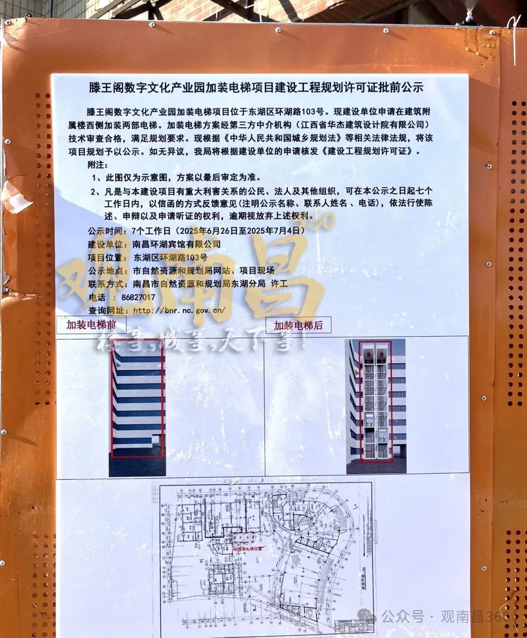 建设单位为南昌环湖宾馆有限公司, 现建设单位申请在建筑附属楼内侧加装两部电梯。显然,这样的做法是为了弥补老式建筑先天不足的问题。