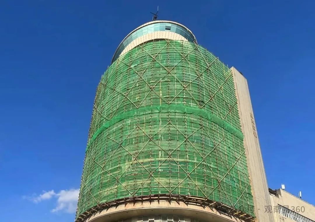 环湖宾馆 转角处外部已经挂满了施工绿网,工人正在对其外立面进行前期改造施工。