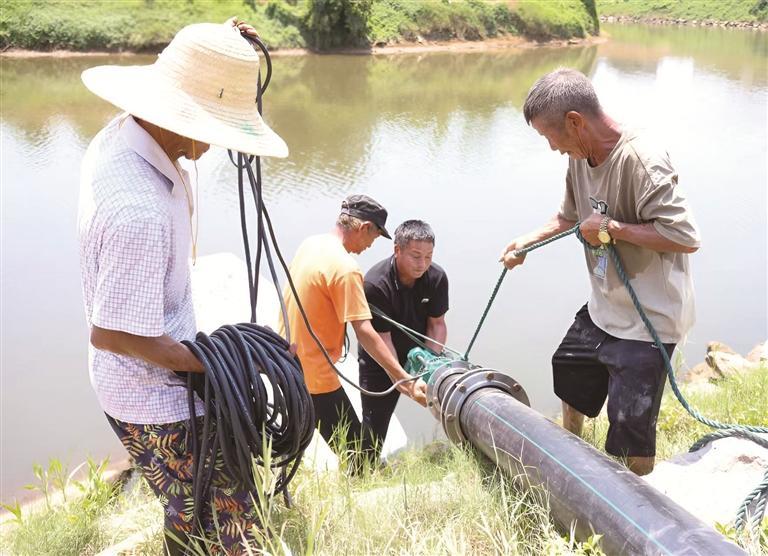 连日来,万年县各级干部深入田间地头,科学调度水源,多措并举抗旱,全力保障农业生产用水需求。图为齐埠乡程家垱村村民在安装潜水水泵,抽万年河水补济抗旱水源。徐声高 摄