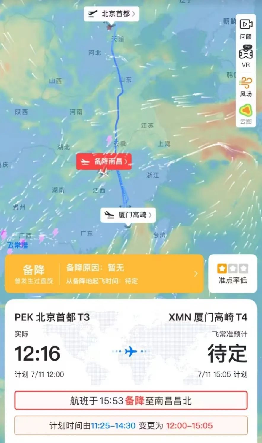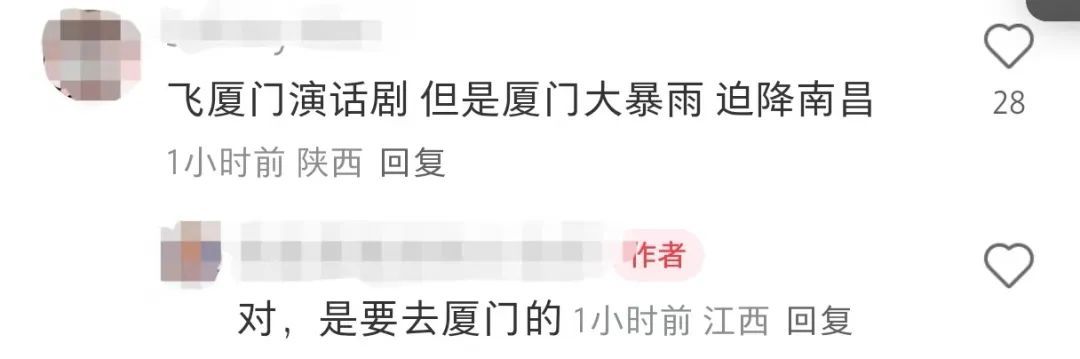记者注意到,由北京飞往厦门的航班于11日15时53分备降至南昌昌北,计划时间由11:25-14:30变更为12:00-15:05。评论区有网友表示:“他下午应该要飞厦门的,有话剧演出,不过因为厦门台风演出取消了。”