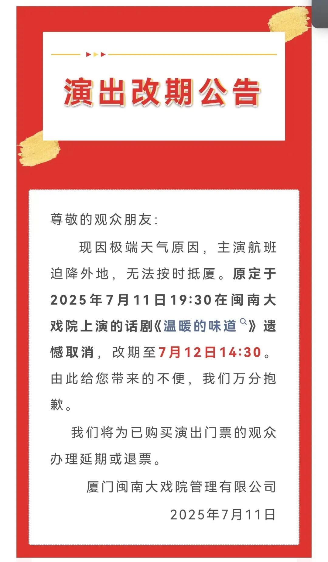 闽南大戏院公众号相关推文显示,由中国煤矿文工团出品的话剧《温暖的味道》将于7月11日至12日在厦门连演两场,其中刘昊然担任主演,饰演“第一书记”孙光明。11日晚,记者致电闽南大戏院,工作人员称,“受天气影响,演员没办法到场,延期到明天下午两点半。”