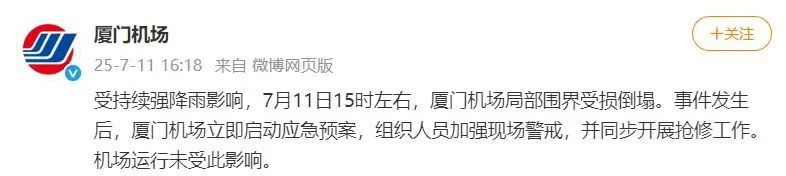 受持续强降雨影响,7月11日15时左右,厦门机场局部围界受损倒塌。事件发生后,厦门机场立即启动应急预案,组织人员加强现场警戒,并同步开展抢修工作。机场运行未受此影响。