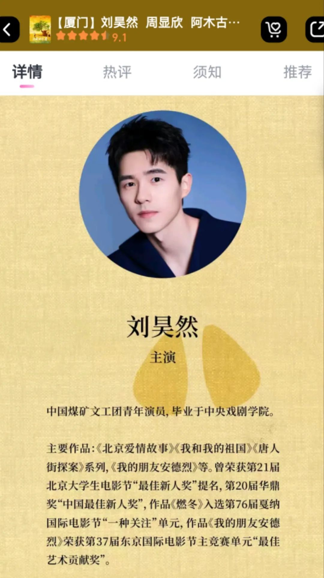 刘昊然,中国煤矿文工团青年演员,毕业于中央戏剧学院。主要作品:《北京爱情故事》《我和我的祖国》《唐人街探案》系列,《我的朋友安德烈》等。曾荣获第21届北京大学生电影节“最佳新人奖”提名,第20届华鼎奖“中国最佳新人奖”,作品《燃冬》入选第76届戛纳国际电影节“一种关注”单元,作品《我的朋友安德烈》荣获第37届东京国际电影节主竞赛单元“最佳艺术贡献奖”。