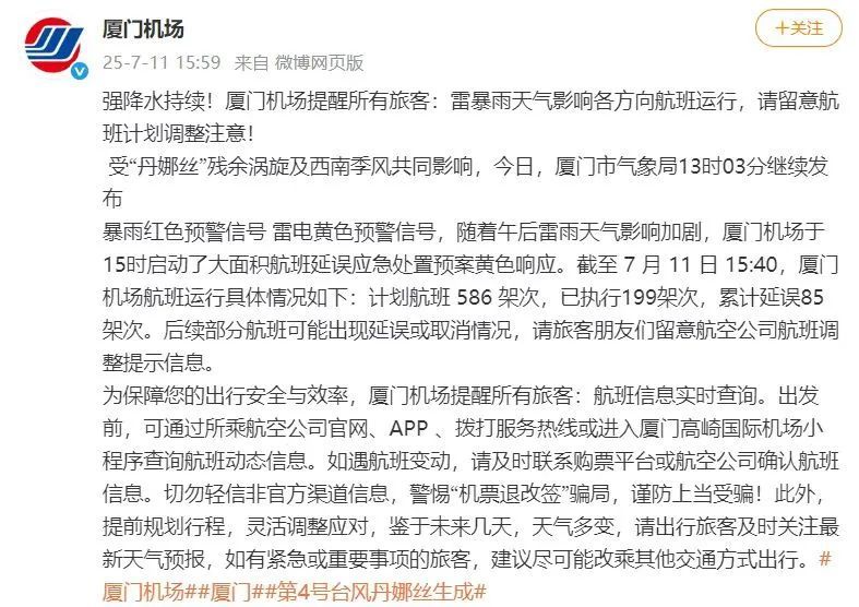 此前,@厦门机场 发文称:厦门机场于15时启动了大面积航班延误应急处置预案黄色响应。
