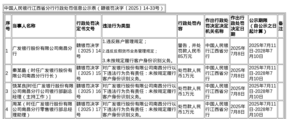 蓝鲸新闻7月11日讯,近日,中国人民银行江西省分行发布了罚单,剑指广发银行股份有限公司南昌分行及其相关责任人。