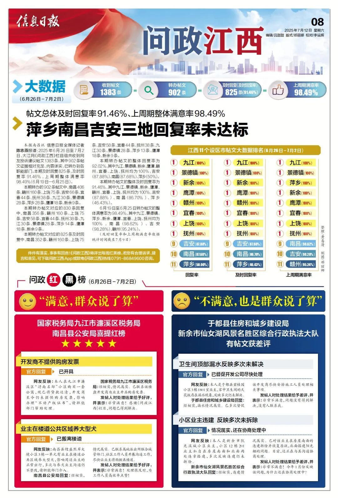 2025年6月26日至7月2日,大江网《问政江西》栏目组共收到网友投诉建议帖文1383条,其中902条帖文证据相对充足、内容详实,已转办到各职能部门。本期及时回复825条,及时回复率91.46%,上周期整体满意率98.49%(6月19日—6月25日)。