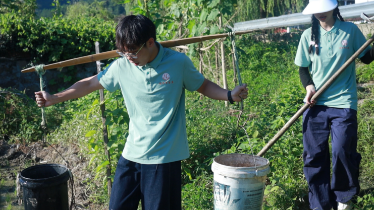 当晨露还挂在藤蔓上时,枫林村的田垄间已响起年轻的笑语。实践队成员在村民指导下,有序投入农事。他们俯身田垄,翻土除草,浇水施肥,采摘豆荚。泥土弄脏裤脚,汗水浸湿后背,却没人停下。实践队以实际劳作践行助农初心,在汗水中领悟“粒粒皆辛苦”的真谛。