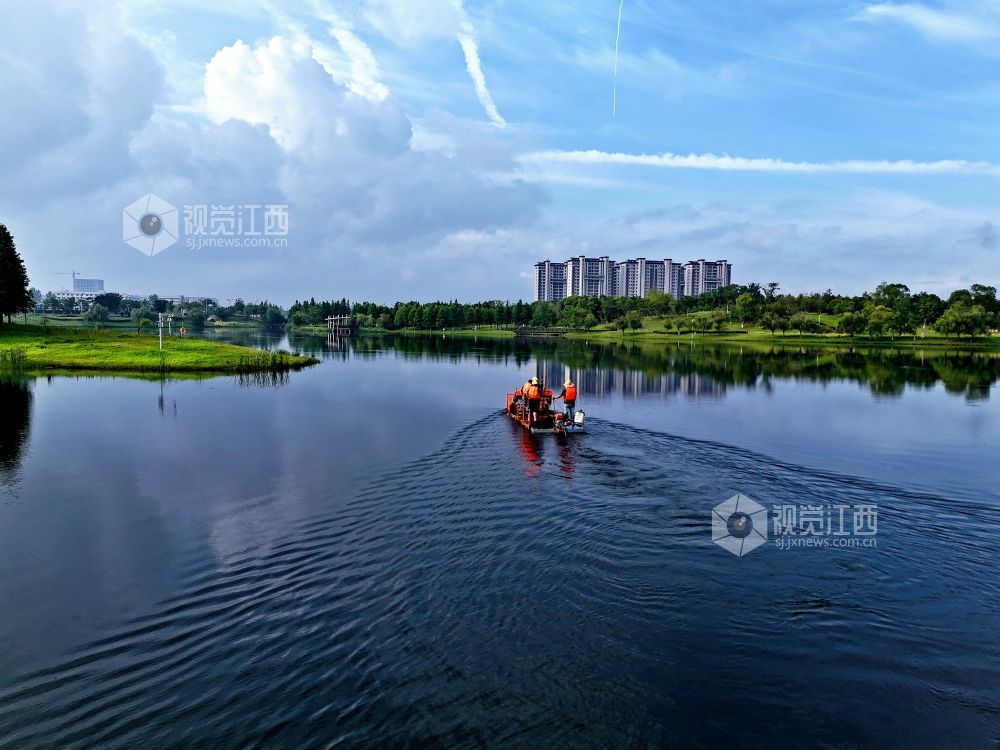 2025年7月13日,在江西省赣江新区中医药科创城星海湖公园,环卫工人冒着酷暑驾驶水草收割船在星海湖来回穿梭,进行水草收割作业。近日,持续的高温天气使星海湖内的水草进入“野蛮生长期”,为维护水域生态平衡,环卫工人通过不间断巡湖收割作业,抑制水草生长,保护水环境。 视觉江西 袁骏 摄
