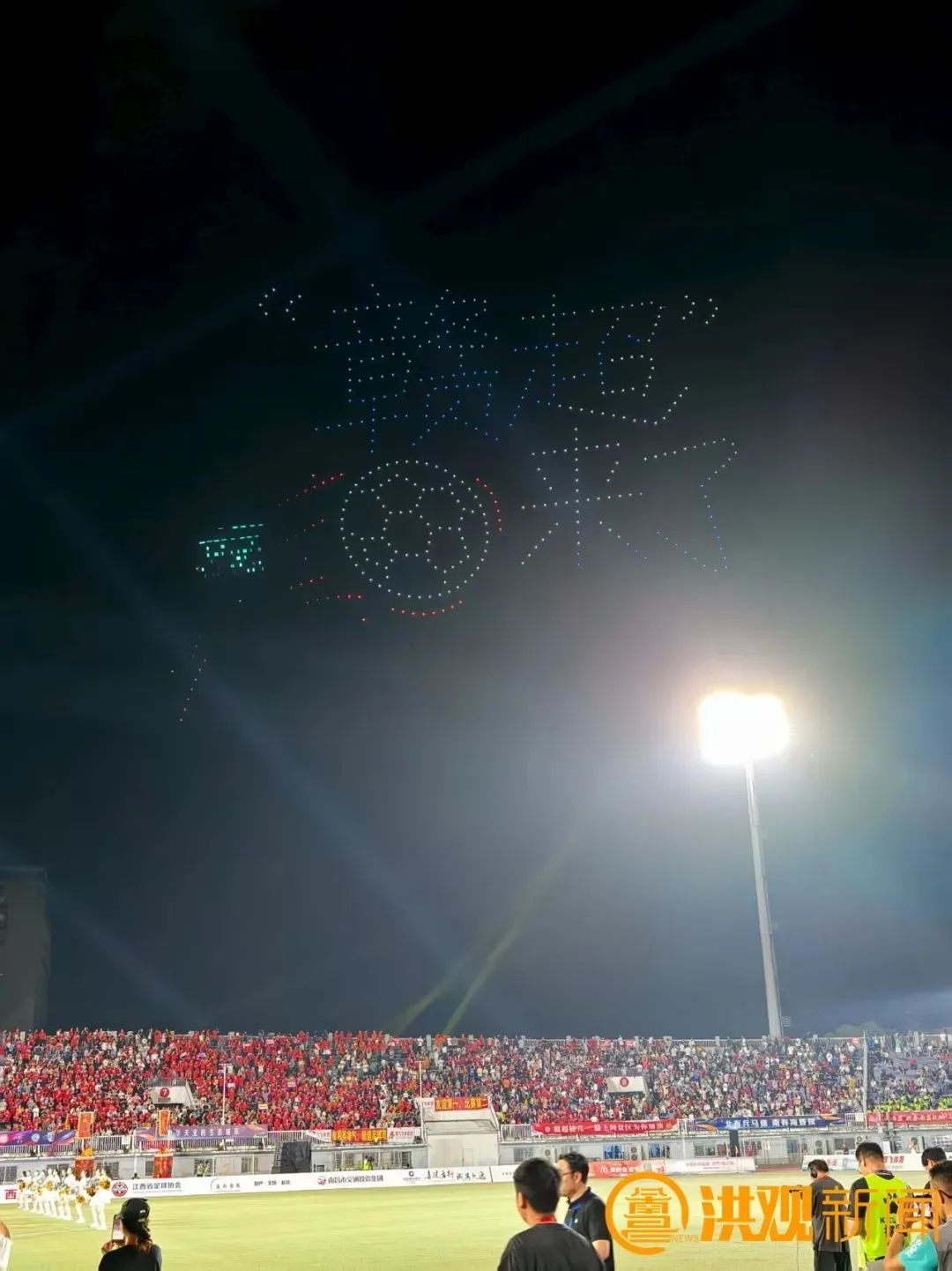 上半场,南昌队与景德镇队战平。中场休息期间,20名“足球宝贝”在球场中央跳起欢乐的啦啦操,球场上空,数百架无人机在空中组成“运动赣鄱 活力江西”“‘赣超’来了”“运动员”等字样和图案;随后,火爆全网的“奢香女孩”郑心怡带来一首《奢香夫人》,引得全场合唱。