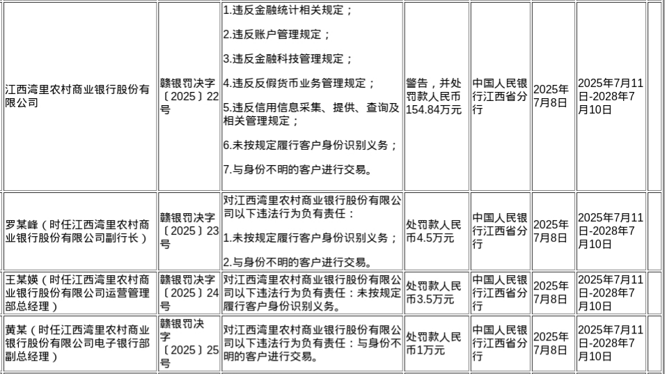 罚单显示,江西湾里农村商业银行股份有限公司的主要违法违规行为是:违反金融统计相关规定;违反账户管理规定;违反金融科技管理规定;违反反假货币业务管理规定;违反信用信息采集、提供、查询及相关管理规定;未按规定履行客户身份识别义务;与身份不明的客户进行交易。