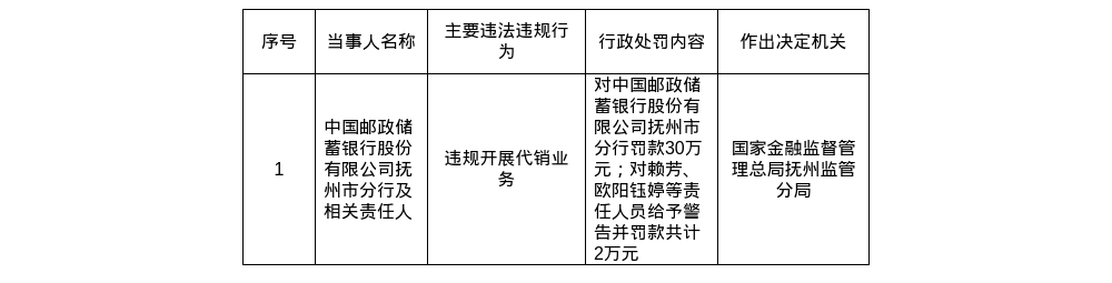 罚单显示,中国邮政储蓄银行股份有限公司抚州市分行的主要违法违规事实是:违规开展代销业务。