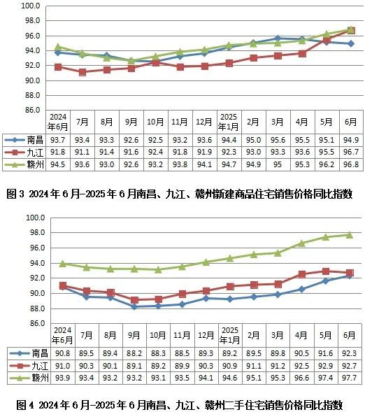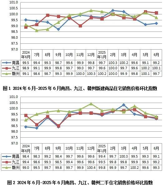 从环比看,新建商品住宅价格两降一涨,二手住宅价格三城市下降。新建商品住宅销售价格方面,6月份南昌、九江和赣州环比分别下降0.8%、上涨0.1%和下降0.3%。二手住宅价格方面,6月份南昌、九江和赣州环比分别下降0.9%、0.8%和0.7%。