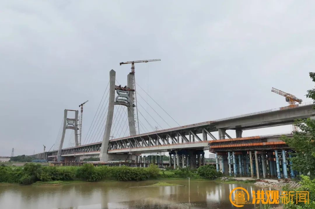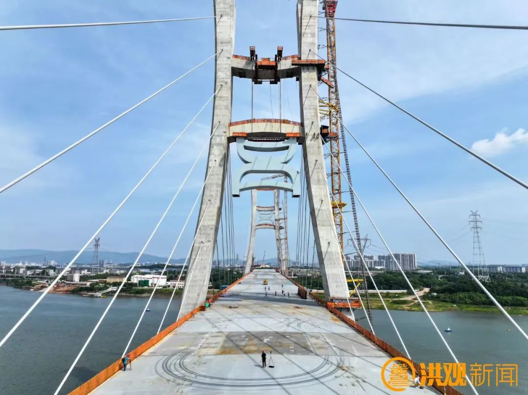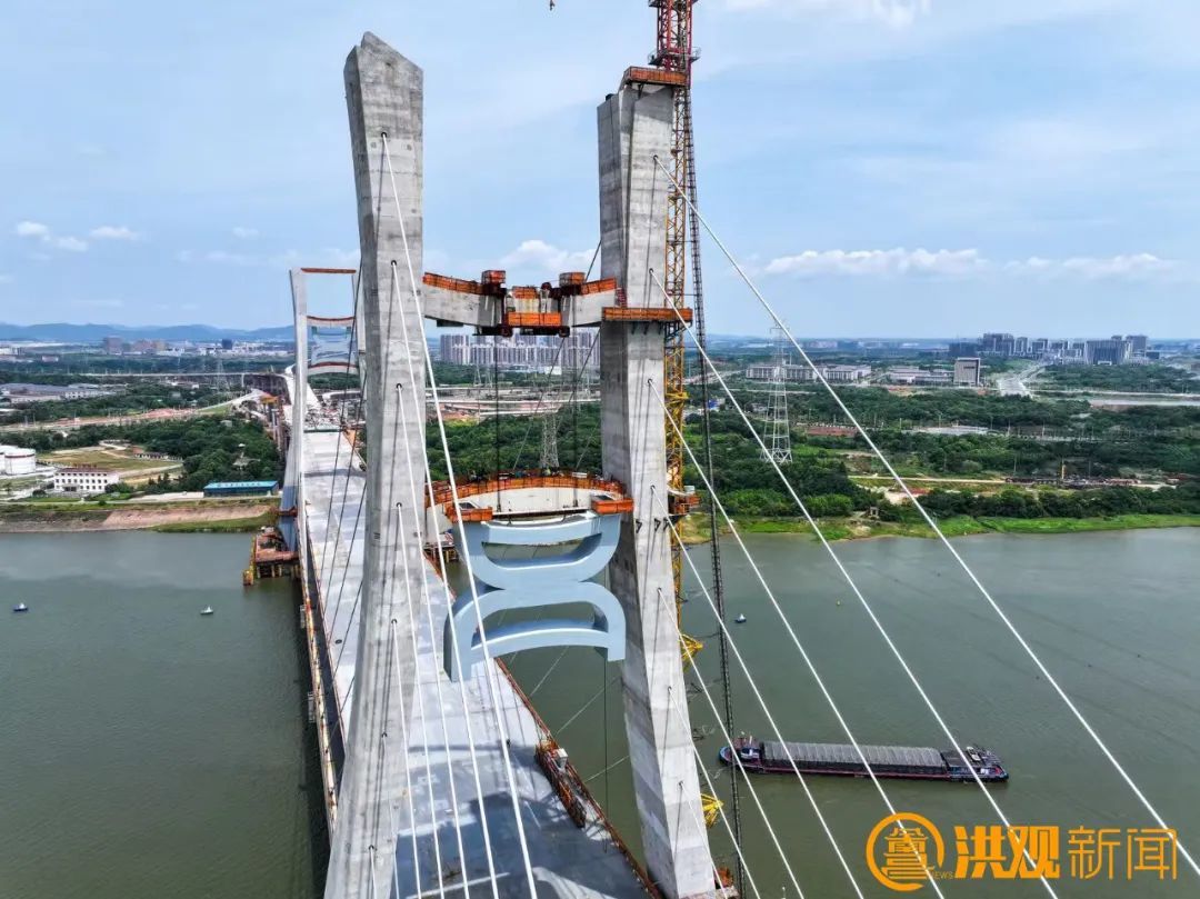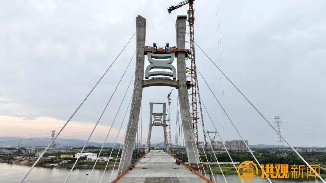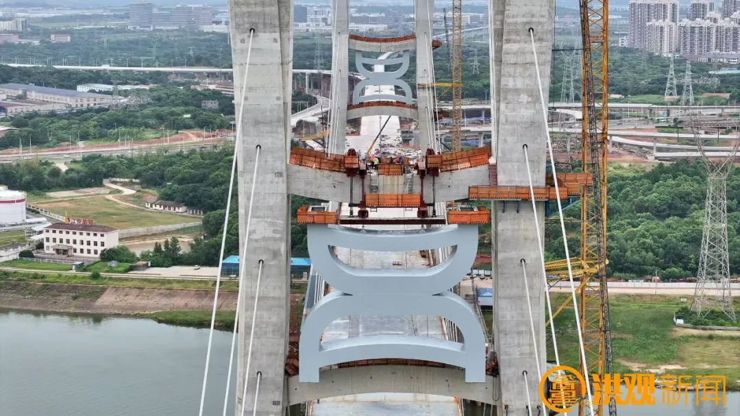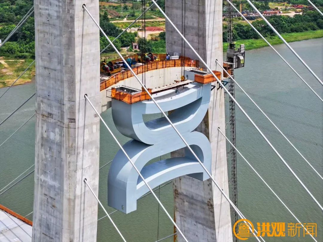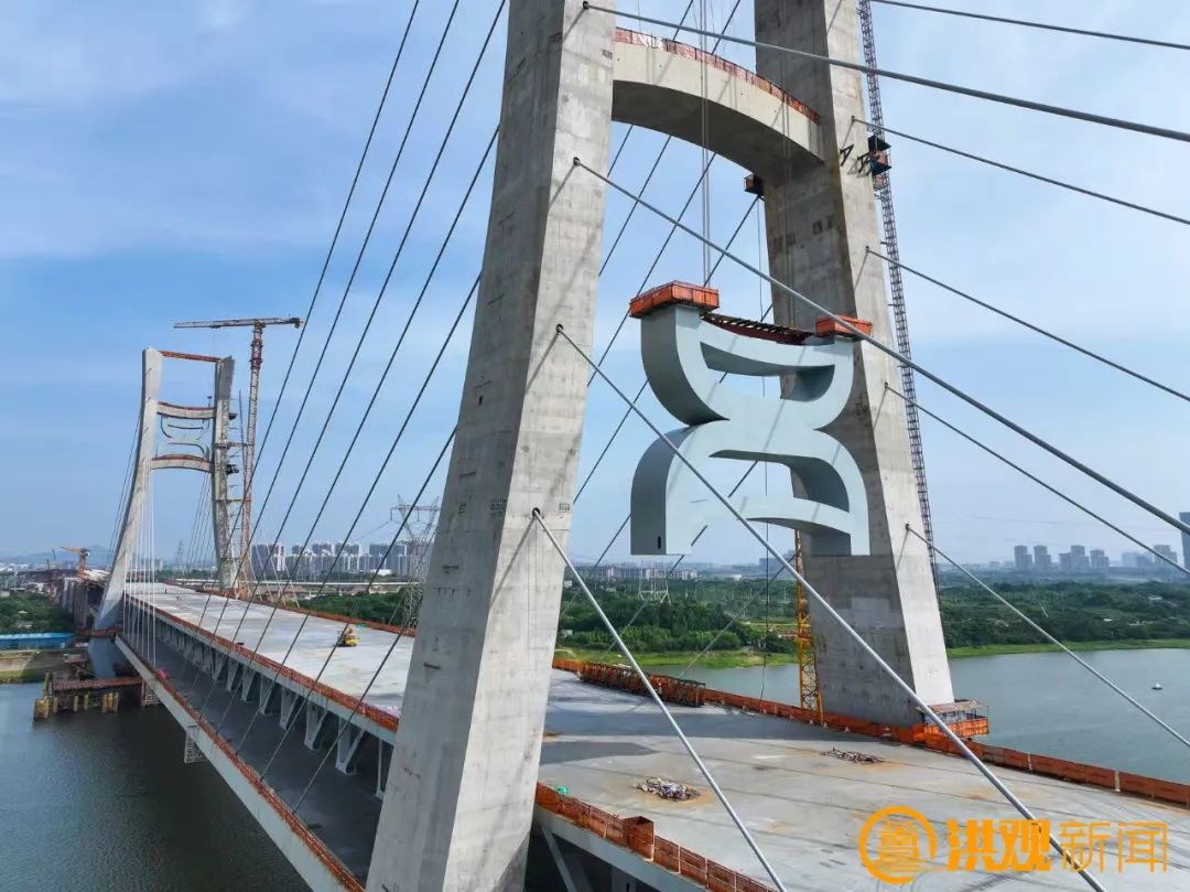 在桥梁宽阔的桥面上,粗壮的钢索如“钢铁手臂”,牢牢锁住“昌”字装饰件,独特的曲线造型,与桥塔构成奇妙呼应,还未完全就位,便已显露出强烈的艺术张力。“施工过程中,我们要确保桥面风力不能超过6级,遇到特殊情况或恶劣天气,卷扬机会及时进行刹车锁定。”中铁大桥局CJZQ-5标项目部现场经理罗文亮告诉记者。