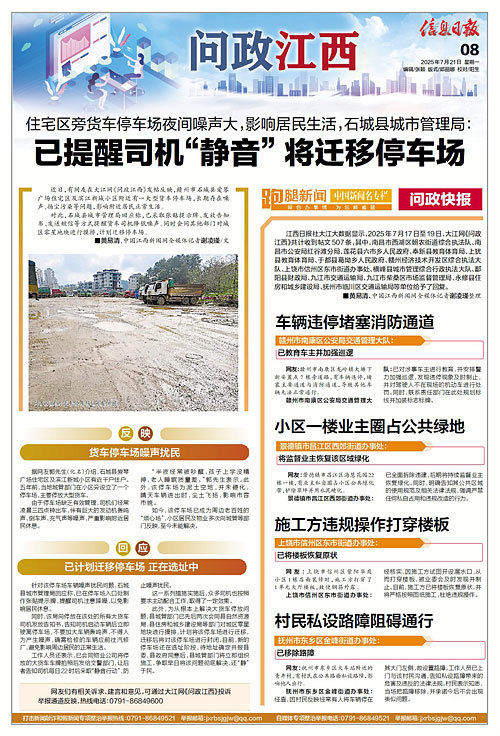 江西日报社大江大数据显示,2025年7月17日至19日,大江网《问政江西》共计收到帖文507条,其中,南昌市西湖区朝农街道综合执法队、南昌市公安局红谷滩分局、莲花县六市乡人民政府、奉新县教育体育局、上犹县教育体育局、于都县葛坳乡人民政府、赣州经济技术开发区综合执法大队、上饶市信州区东市街道办事处、横峰县城市管理综合行政执法大队、鄱阳县财政局、九江市交通运输局、九江市柴桑区市场监督管理局、永修县住房和城乡建设局、抚州市临川区交通运输局等单位给予了回复。