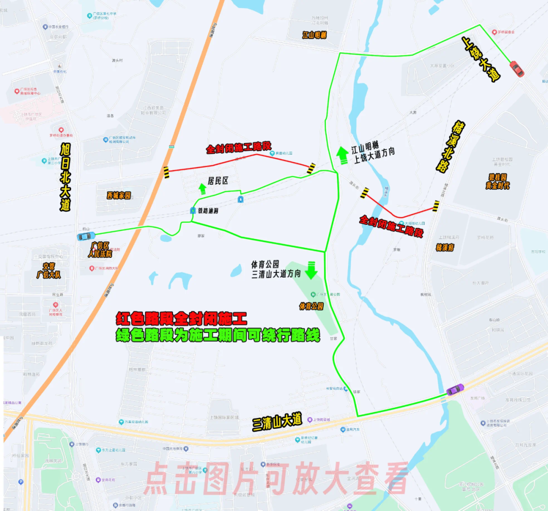 施工期间,本地居民车辆可经由广信区法院侧边路口驶入,经由铁路涵洞进入居民区。绕行路线北向可至上饶大道、南向可至三清山大道,具体管制路线及绕行路线见下方地图标注。