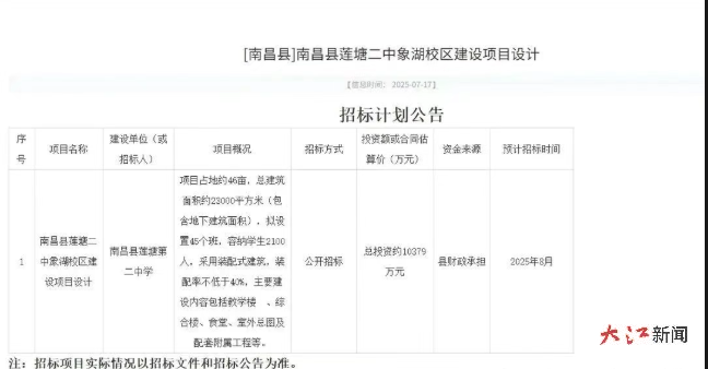 项目设计招标公告显示,莲塘二中象湖校区项目占地约46亩,总建筑面积约2.3万平方米(包含地下建筑面积》,拟设置45个班,容纳学生2100人,采用装配式建筑,装配率不低于40%,主要建设内容包括教学楼、综合楼、食堂及配套附属工程等。项目总投资约10379万元,计划2025年8月启动设计招标。