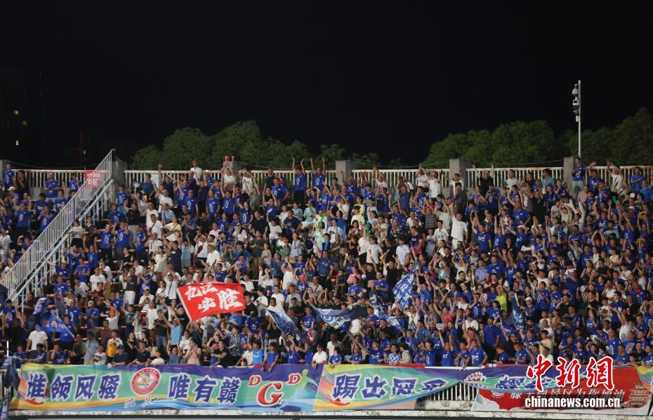 7月20日,九江队球迷在比赛现场呐喊助威。当晚,2025年江西省城市足球联赛(简称“赣超”)第二轮比赛在江西省南昌市八一体育场举行,现场涌入约1.6万名球迷观赛。最终,南昌队主场2比3不敌九江队。中新社记者 刘占昆 摄