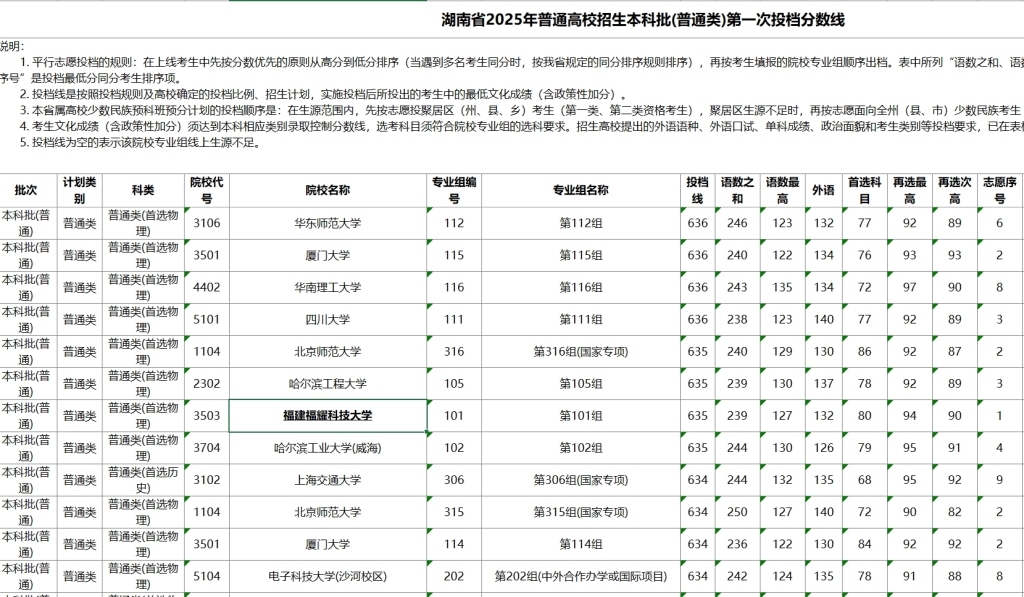 投档线是按照投档规则及高校确定的投档比例、招生计划,实施投档后所投出的考生中的最低文化成绩(含政策性加分)。据湖南省教育考试院公布的2025年本科批第一次投档分数线信息,物理类投档线最高的为北京大学第104组、清华大学第103组和上海交通大学第103组,均为685分,武汉大学第107组680分排在第二位,北京大学医学部第101组679分排第三位。而福耀科技大学第101组投档线为635分,直追636分的北京交通大学第106组、大连理工大学第102组、华东师范大学第112组、厦门大学第115组、华南理工大学第116组、四川大学第111组。
