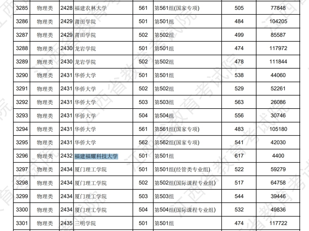 另据江西省教育考试院官网7月20日发布的《江西省2025年普通高校招生本科投档情况统计表(历史类、物理类、三校生类) 》,物理类中,福耀科技大学第501专业组投档线为617分,最低投档排名4400名。