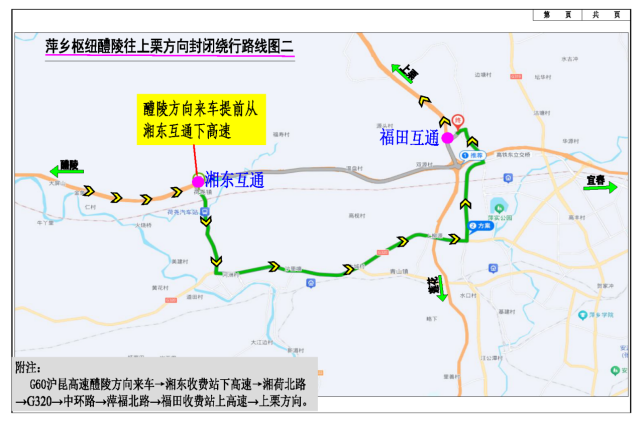 G60沪昆高速醴陵方向来车→湘东收费站下高速→湘荷北→G320→中环路→萍福北路→福田收费站上高速→上栗方向。