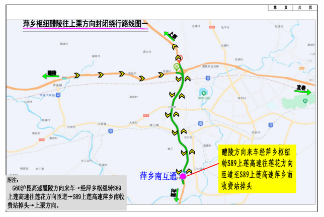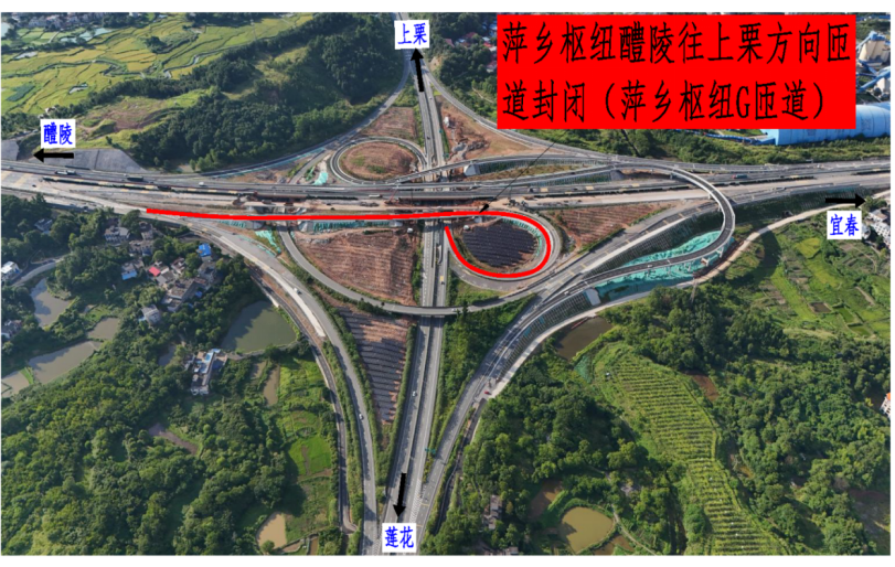 G60沪昆高速由西往东(醴陵方向来车)经萍乡枢纽往S89上莲高速上栗方向匝道封闭,封闭起止时间2025年8月15日10时-9月2日10时(共19天)。