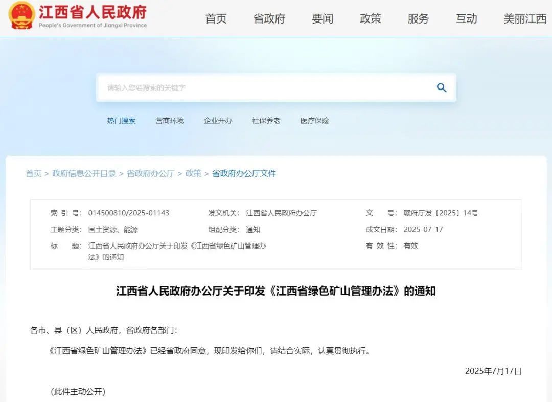 江西省人民政府办公厅关于印发《江西省绿色矿山管理办法》的通知